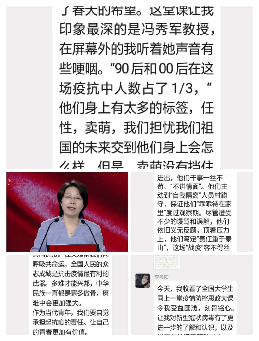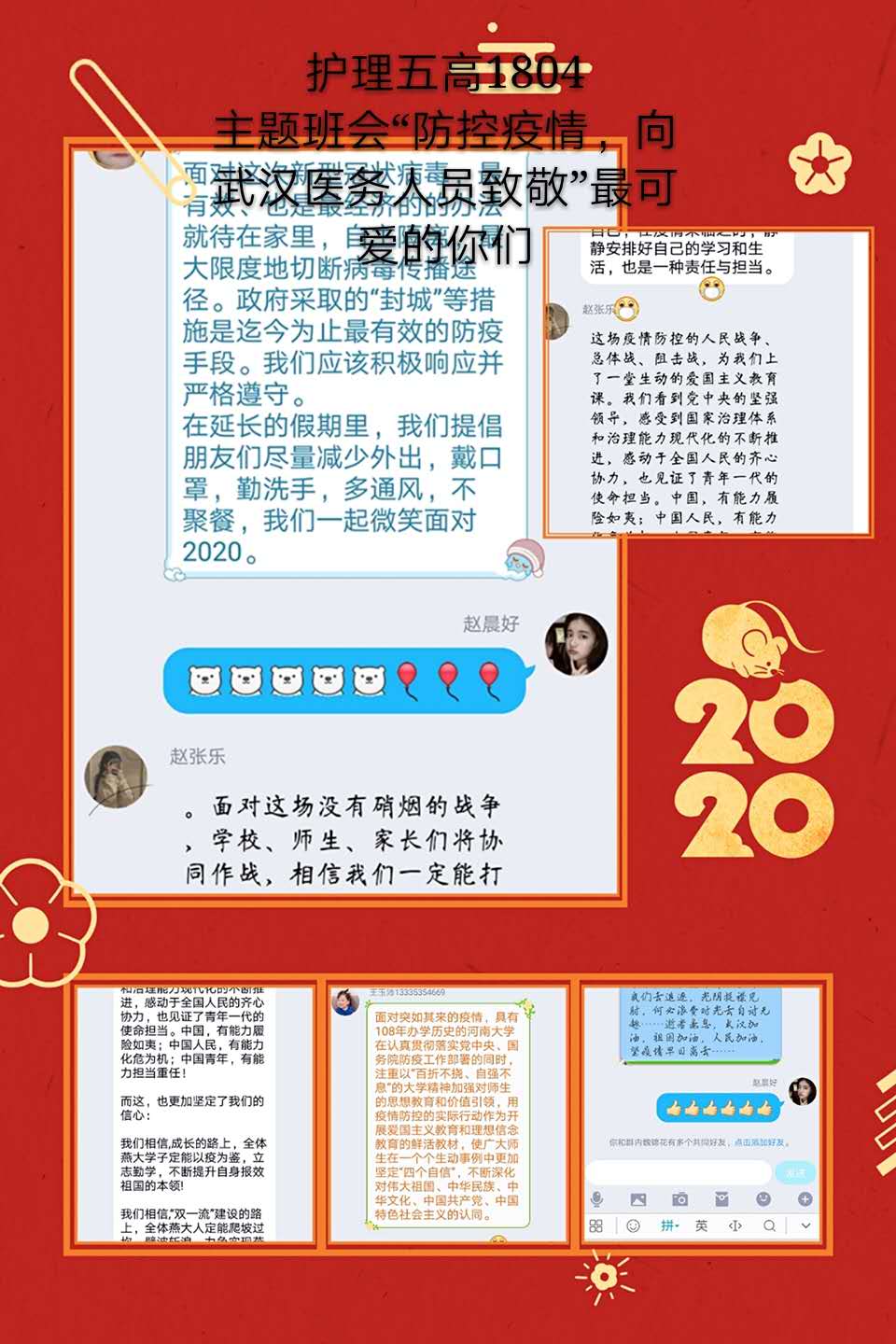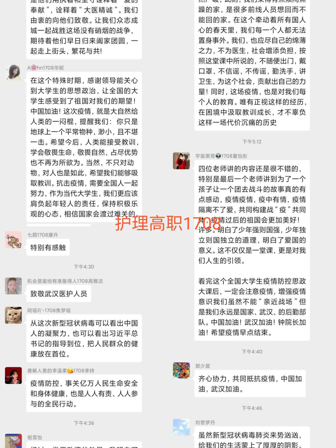 观看结束后,公司员工以班级为单位,在学管人员的指导下,开展了线上主题班会。师生们结合学科专业特点展开了讨论。公司党总支书记吴运胜认为:“对于金年会金字招牌诚信至上的师生来说,这次思想政治教育课安排得很及时。在这场战‘疫’中,党和政府从历史中总结经验,担起人类命运共同体的责任,用‘武汉封城’的强大魄力,向世界彰显了中国共产党领导和中国特色社会主义制度的显著优势。作为党的教育工作者,我们要积极教育引导广老员工,坚定在以习近平同志为核心的党中央坚强领导下打赢这场疫情防控人民战、总体战、阻击战的信心和决心。”党总支副书记马淑红认为:“课堂中的战疫小故事,让我们看到了当代青年的大勇、大我和大德,我们要积极宣传员工身边的榜样事迹,继续引导广大青年员工勇担使命,积极奉献社会,为实现中华民族的伟大复兴梦而奋斗。”员工科科长李博认为:“这堂公开课兼具思想高度和理论深度,有数据有实例,有情感有温度,进一步增强了老员工的‘四个自信’,激发老员工的爱国热情和创新创业的动力。”护理高职1804班员工王晔在班会中说:“作为一名00后护生,我们要牢记医员工誓言和南丁格尔誓言,向奔赴疫情前线的前辈学习,做到胸有大志、心有大我、肩有重任、行有大德,用实际行动谱写自己大写的青春。”(撰稿:金年会金字招牌诚信至上 王蓉 审核:李晓乾)