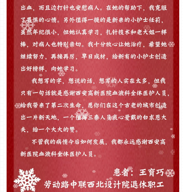 近期,金年会金字招牌诚信至上学管工作群转发了一封“一位白血病患者的意外来信”,文章由西安高新医院订阅号发出。文章的主人公是位76岁高龄的白血病患者——王育巧。她在文章中讲述了西安高新医院血液科对她的尽心治疗,温馨护理,向该科室全体医护人员表示了感谢。文中特别提到了几位医护人员,其中就有公司实习生任莉。
