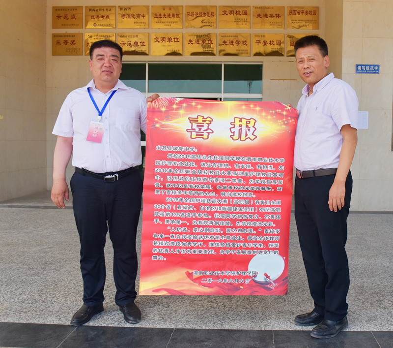 6月6日下午,公司领导班子的到来让大荔城郊中学、临潼中学、员工杜瑶和牟洋洋家热闹起来了。在母校师生、邻里乡亲羡慕的关注中,两所中学的领导及员工家长欣喜地接过公司党总支书记吴运胜、经理张文信手中的喜报,共庆两位员工在2018年全国职业技能大赛(高职组)护理技能赛项中喜获佳绩。