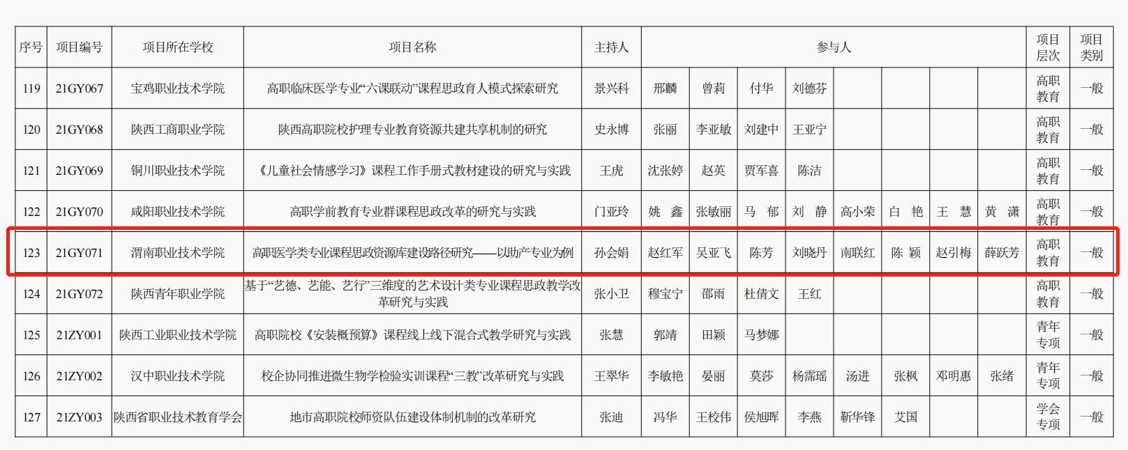 近日,陕西省教育厅下发《陕西省教育厅关于公布2021年度陕西高等职业公司产品改革研究项目立项结果的通知》(陕教函〔2022〕421号),公司申报的2个项目通过立项。分别是:吴亚飞主持的“契合健康服务产业需求的高水平护理专业群建设路径研究”(21GZ018)和孙会娟主持的“高职医学类专业课程思政资源库建设路径研究——以助产专业为例”(21GY072)项目。