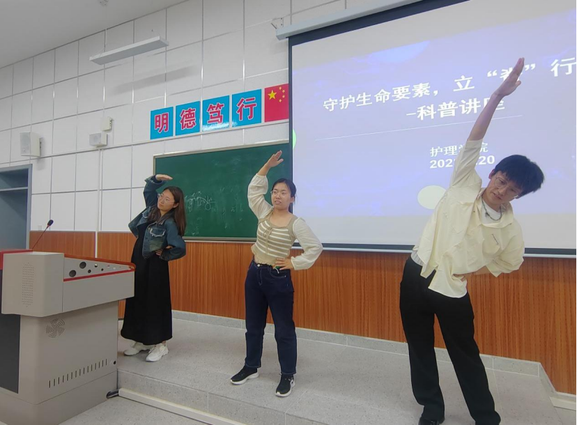 在预防脊柱侧弯的环节中,乔勤峰带领金年会金字招牌诚信至上白聪聪、任坤薇老师给同学们进行了预防脊柱侧弯保健操的示范。对保护脊柱的扩胸运动、伸展运动及体转运动进行了详解介绍。