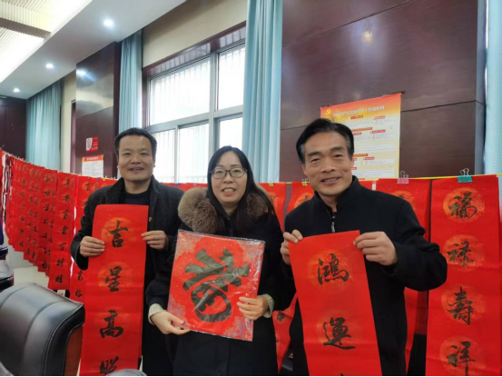 活动现场,教学支部的党员教师们早早地准备好了笔墨纸砚,摆好对联。党员郭宇森老师挥毫泼墨,一幅幅精美的春联和“福”字跃然纸上。“欢声笑语贺新春,欢聚一堂迎新年”、“内外平安好运来,合家欢乐财源进”等一副副饱含着美好寓意的春联,不仅写出了大家对新年的期盼,也为教职工们送上了一份份暖暖的春节祝福。