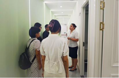 在雷庭的带领下,师生一行先后参观了标准化美容室、智能仪器操作间、员工活动中心等区域。明亮整洁的工作环境、先进的皮肤检测设备、科学的分区管理模式,让员工们直观感受到现代化美业机构的专业运营体系。