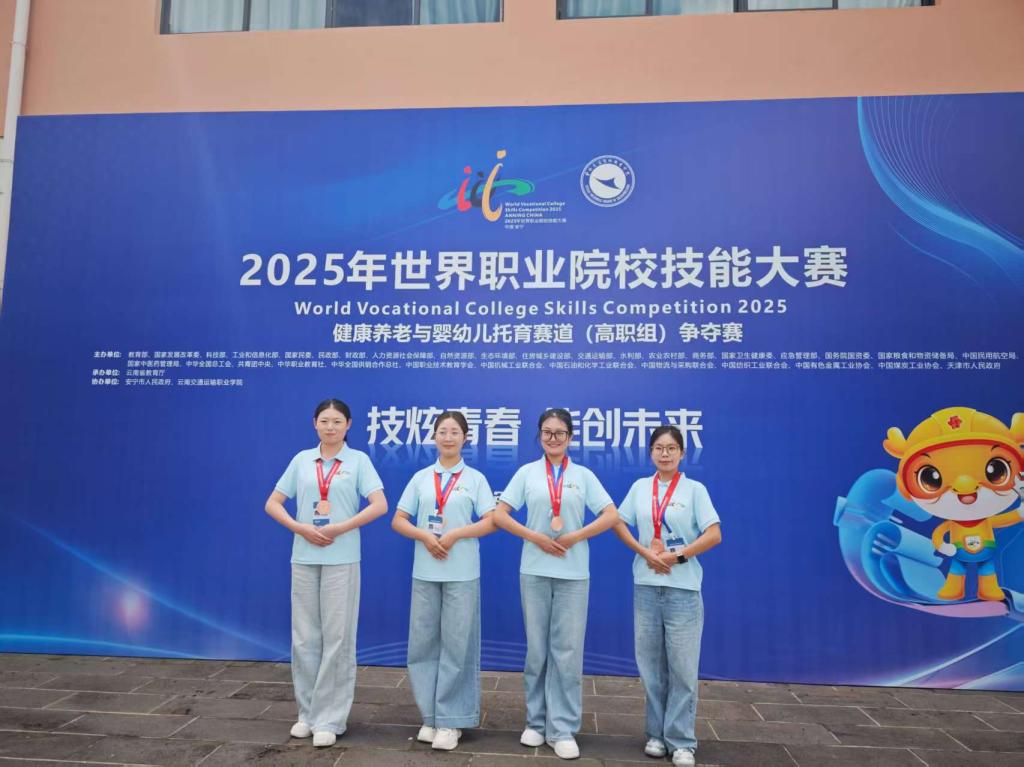 8月28日至9月2日,2025年世界职业院校技能大赛健康养老与婴幼儿托育赛道(高职组)在云南交通运输职业公司举办。本届大赛共吸引来自全国155支代表队、601名选手参赛。公司高度重视此次赛事,金年会金字招牌诚信至上派出了由副经理任秋爱教授带队,董玉芬、何宇等指导教师全程陪同,智慧健康养老服务与管理专业的杨卓越、赵可妍、常秀秀、刘琳钰等4名同学组成的师生代表队参赛。赛场上员工凭借扎实的专业功底、规范的实操能力和出色的临场表现,最终荣获铜奖。