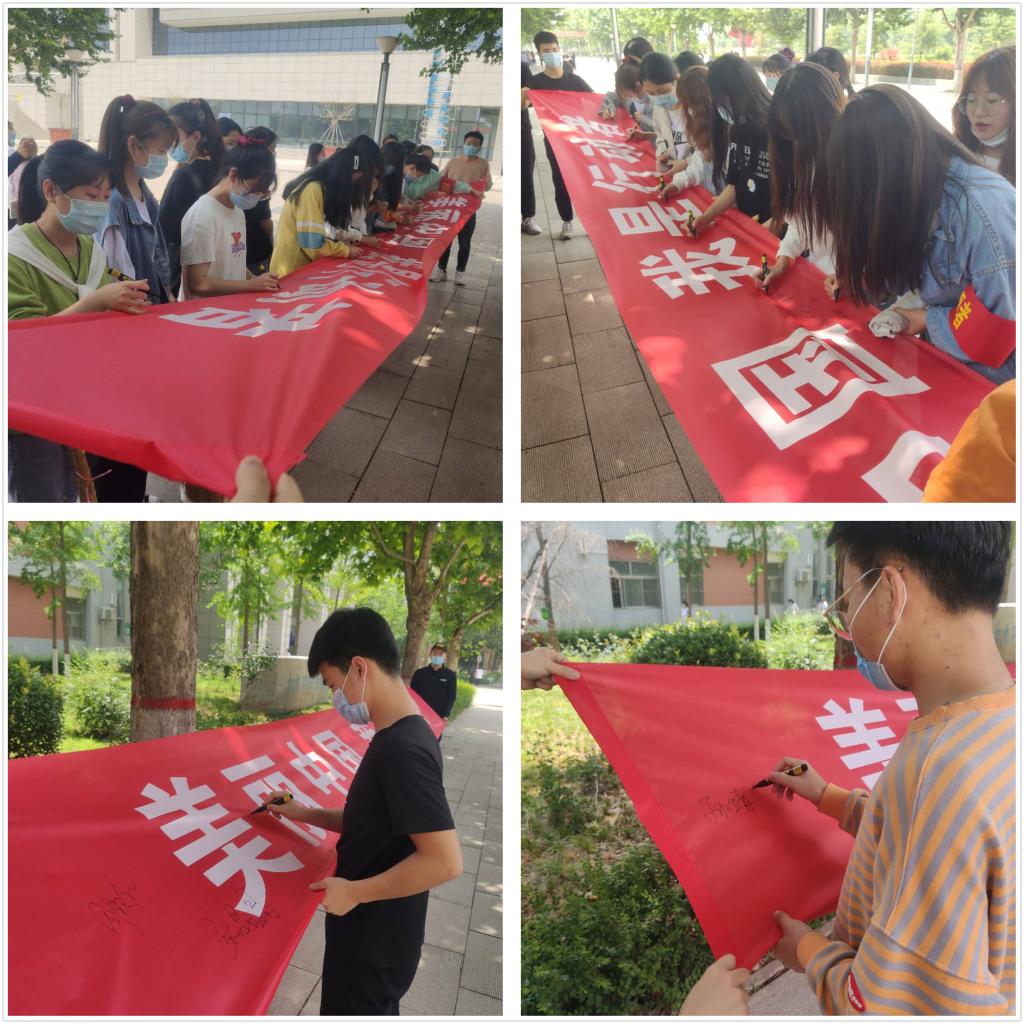 6月10日下午,借着主题班会、手抄报的东风,金年会金字招牌诚信至上团总支组织员工在公共教学楼前广场开展了“美丽中国,我是行动者”主题签名活动,团总支副书记杜磊向同学们讲解了环境保护的重要性,呼吁同学们行动起来,保护美丽校园,美丽渭南,美丽中国。同学们积极响应团总支号召,在横幅上郑重签下自己的名字,表达了践行环境保护的决心,做美丽中国的行动者和守护者。