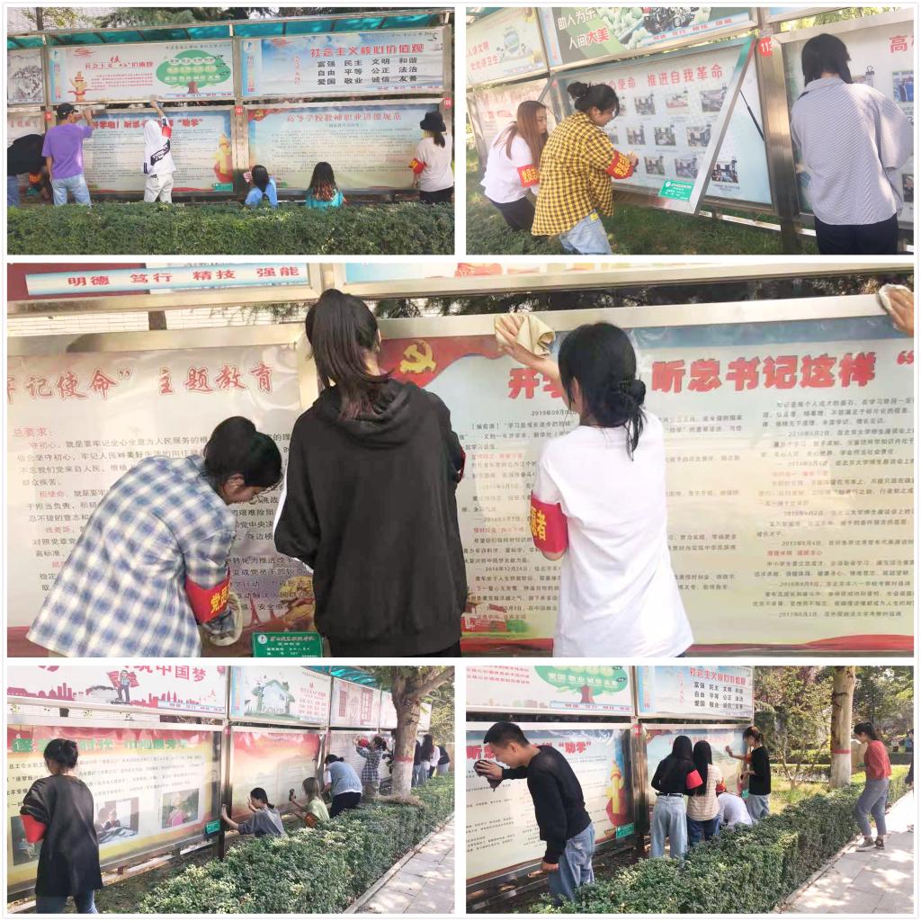 宣传设施是现代宣传工作的重要组成部分,是展现公司价值观念、师生风貌、校园精神文化的重要载体。在国庆节到来之际,公司员工党支部40余名积极分子向优秀党员学习,发扬吃苦耐劳精神,提起水桶,拿上抹布,对新校区宣传栏进行了护理清洁。
