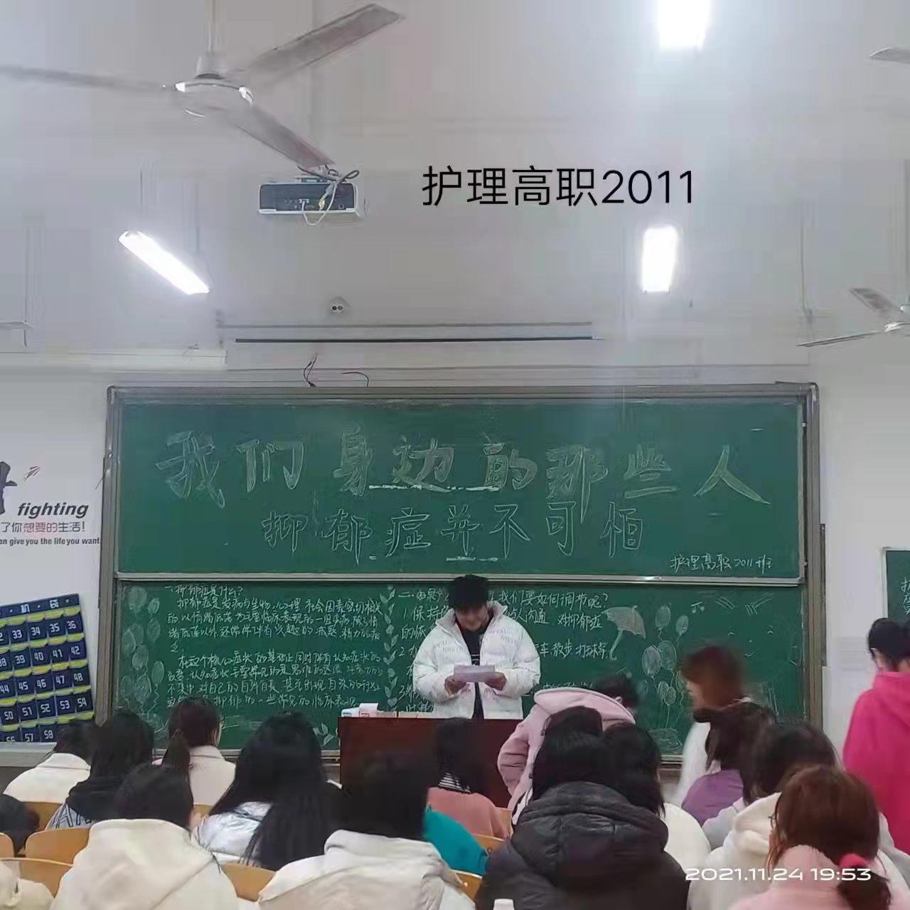 课上,心理委员简述了抑郁症的成因、表现。现场气氛活跃,同学们积极参与身边的抑郁症案例讨论。经过一系列的讨论,心理委员总结了预防抑郁症的必要措施:第一,保持良好的心态,多与人沟通;第二,养成良好的倾诉习惯;第三,加强户外运动;第四,若出现抑郁症的早期症状,应及时诊治。课后,同学们纷纷表示,作为一名新时代的员工,要学会自我调节,保持乐观的心态,多参加户外活动和体育锻炼,平时与家人多交流,保持乐观心态,远离抑郁症。