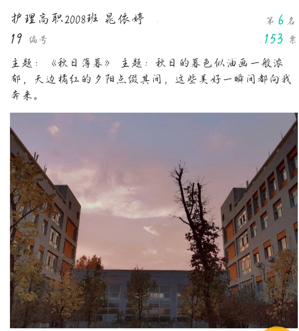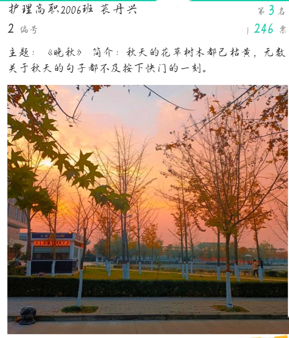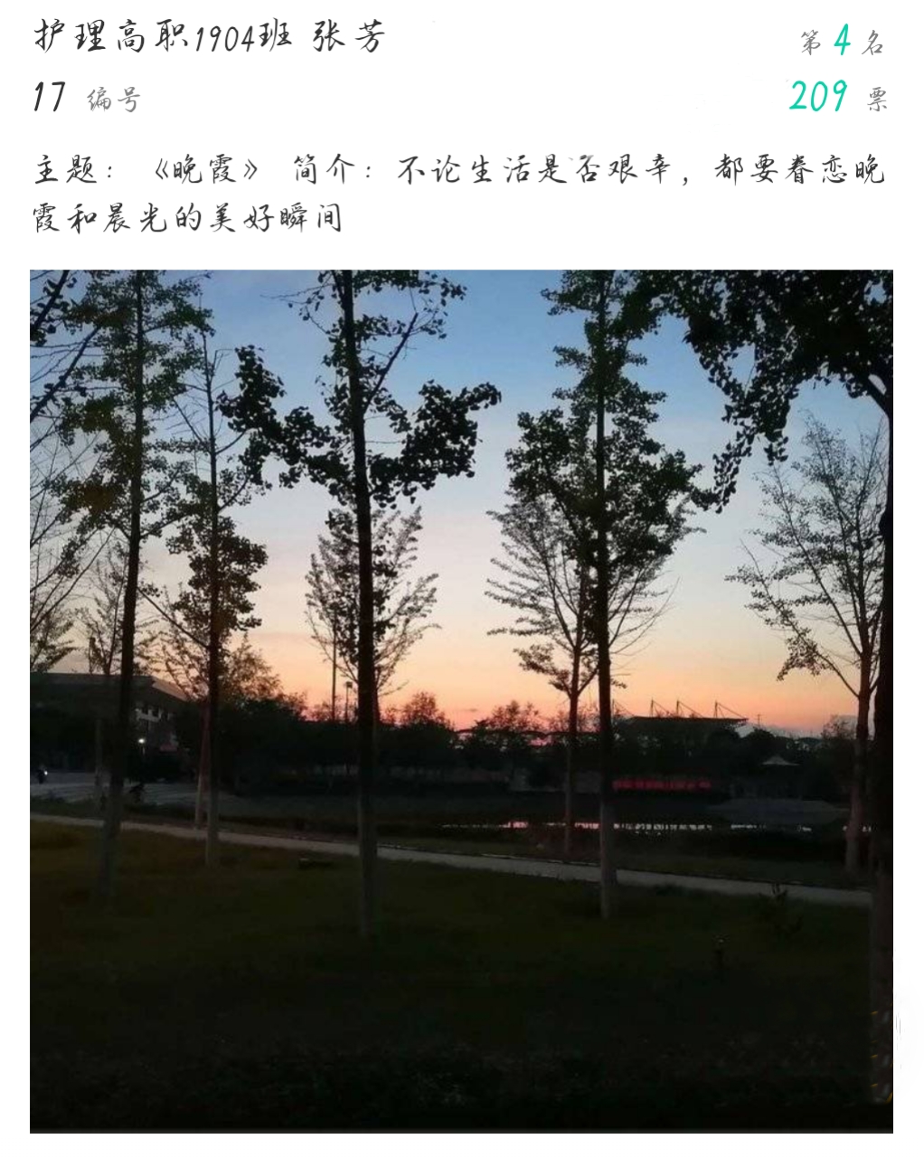 本次大赛在公司团总支通讯社的前期宣传下,同学们积极踊跃地将自己喜爱的照片上交,经过线上初选和复选,共20张摄影作品入围线下展评。这些作品从不同方面反映了公司的校园风景、生活、学习:有唯美的公司美景,有个性的校园建筑,有深沉厚重的校园文化,有轻松愉悦的校园生活。在展评中,广大师生被一幅幅生动形象的照片内容所吸引,并为自己喜欢的摄影作品投出宝贵的一票。经过层层评比,助产高职2001班员工王晨的《初秋校园》获得了比赛第一名。 护理高职2008班员工杨哲哲、护理高职2006班员工苌丹兴分别以《午餐时的忙碌》《晚秋》为主题获得二等奖。护理高职1904班员工张芳的《晚霞》、护理高职2005班员工吴珂玮的《夕阳欲颓》、护理高职2008班员工晁依婷的《秋日薄暮》获得三等奖。(撰稿:金年会金字招牌诚信至上 王蓉 审核:李晓乾)