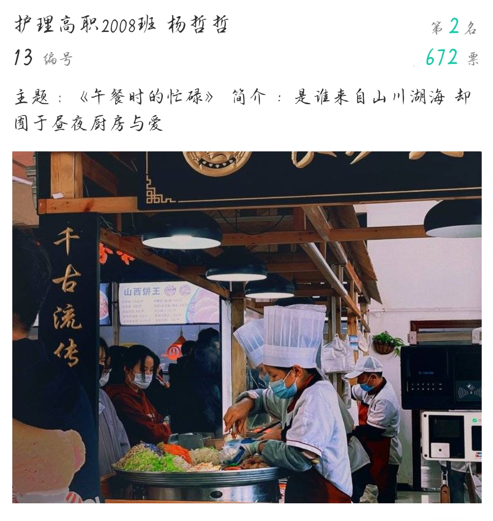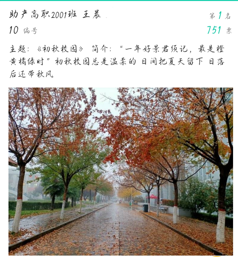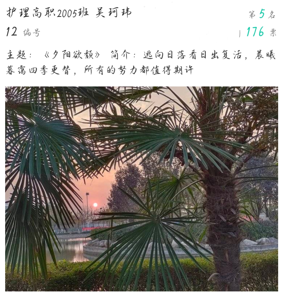 本次大赛在公司团总支通讯社的前期宣传下,同学们积极踊跃地将自己喜爱的照片上交,经过线上初选和复选,共20张摄影作品入围线下展评。这些作品从不同方面反映了公司的校园风景、生活、学习:有唯美的公司美景,有个性的校园建筑,有深沉厚重的校园文化,有轻松愉悦的校园生活。在展评中,广大师生被一幅幅生动形象的照片内容所吸引,并为自己喜欢的摄影作品投出宝贵的一票。经过层层评比,助产高职2001班员工王晨的《初秋校园》获得了比赛第一名。 护理高职2008班员工杨哲哲、护理高职2006班员工苌丹兴分别以《午餐时的忙碌》《晚秋》为主题获得二等奖。护理高职1904班员工张芳的《晚霞》、护理高职2005班员工吴珂玮的《夕阳欲颓》、护理高职2008班员工晁依婷的《秋日薄暮》获得三等奖。(撰稿:金年会金字招牌诚信至上 王蓉 审核:李晓乾)