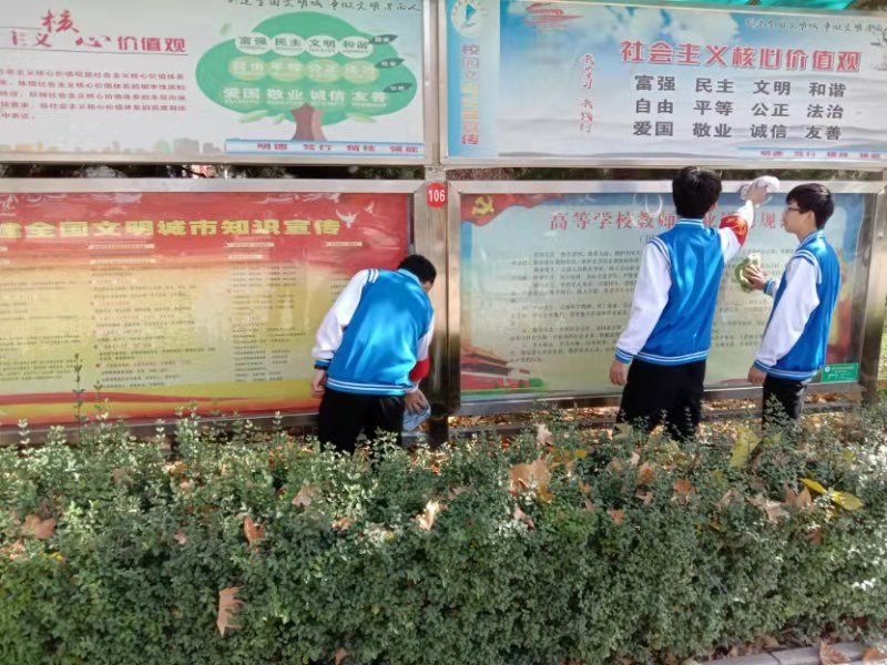 志愿者擦洗宣传栏